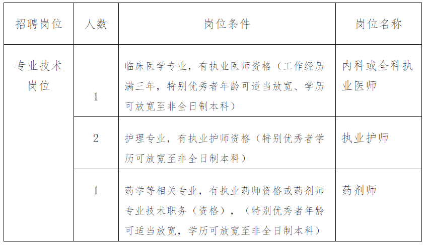本次面向社会公开招聘非事业编药剂师1人、执业护师2人、执业医师1人,招聘岗位、人数详见岗位条件表。