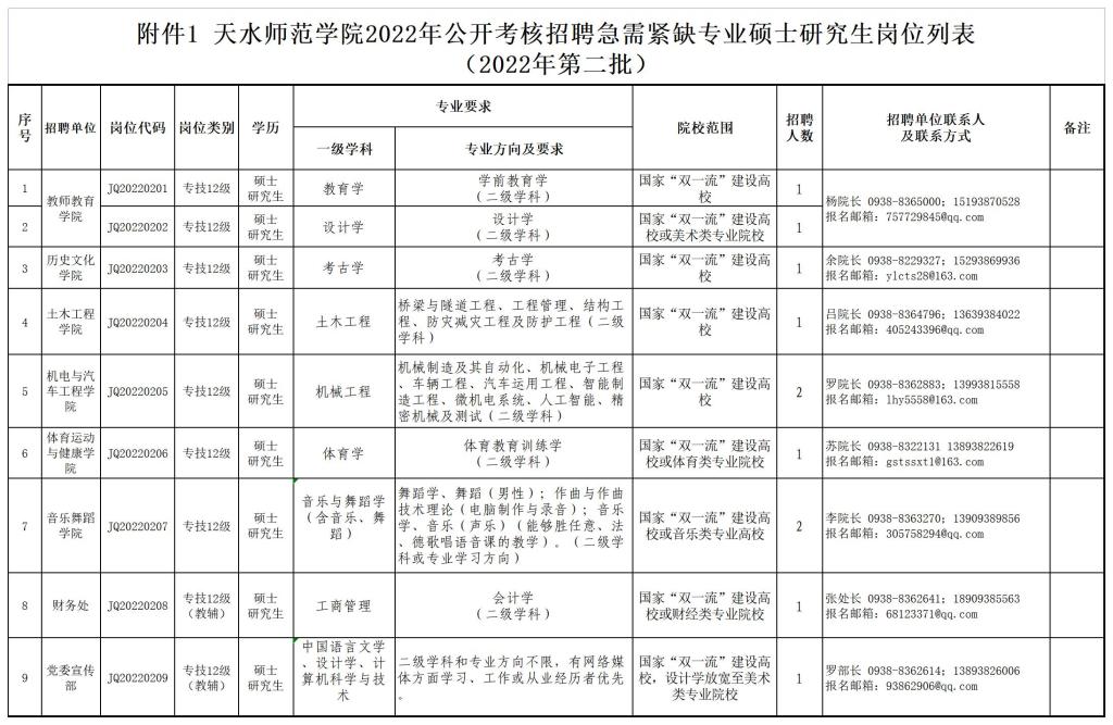 附件1:天水师范学院2022年公开考核招聘急需紧缺专业硕士研究生岗位列表(2022年第二批)
